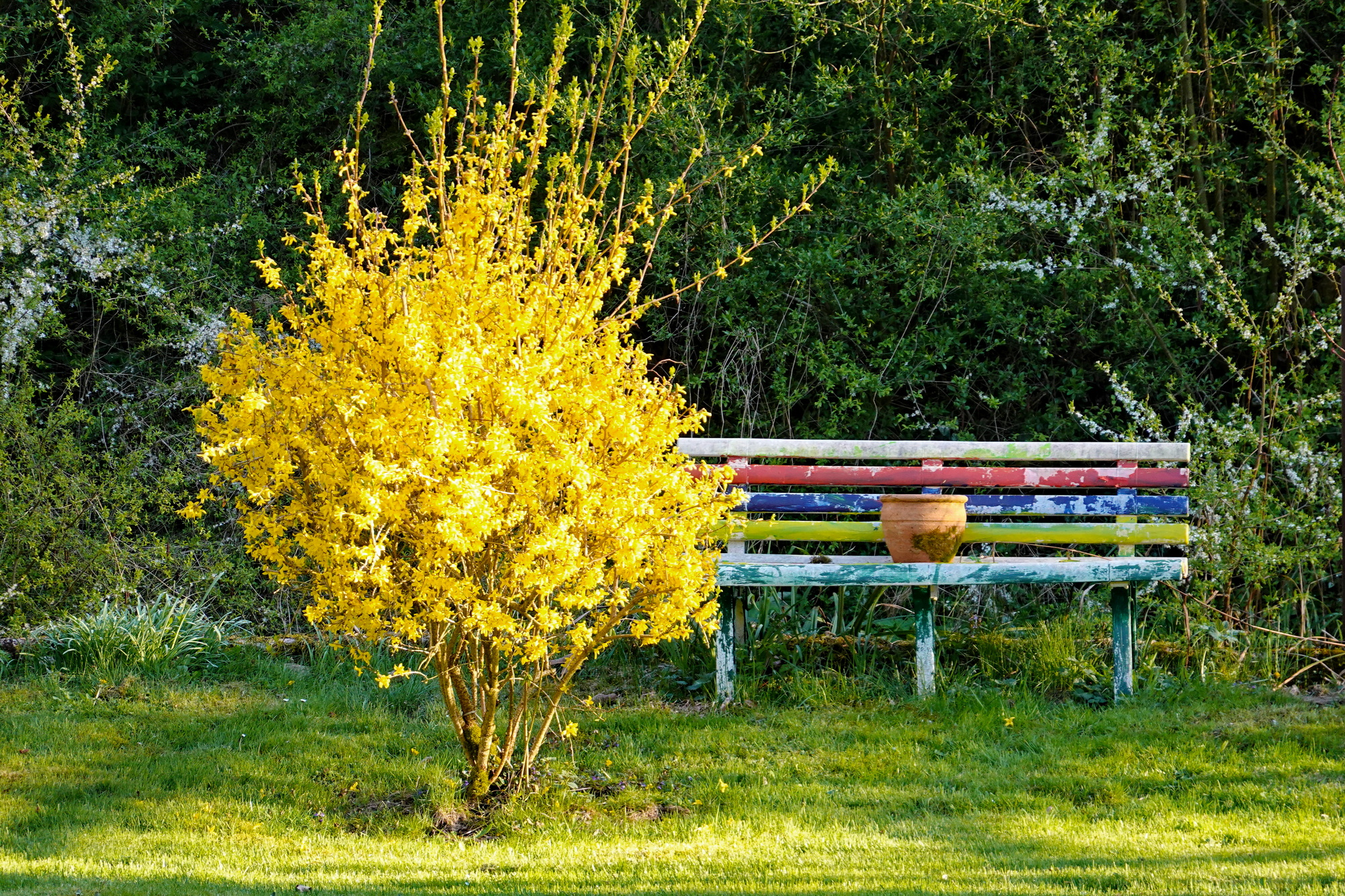 Wieder einmal war ich am Abend im Dorf unterwegs. Ich liebe die abendliche Lichtstimmung. Bei meinem heutigen Streifzug fiel mir diese etwas verwitterte, bunte Gartenbank neben dem leuchtenden Forsythienstrauch ins Auge. Auf der Bank noch ein Blumentopf – das perfekte Stillleben.