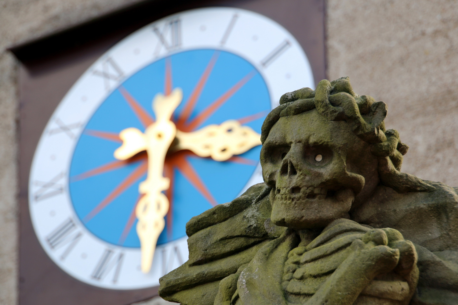 Statue des Todes auf dem Mausoleum an der Kirche in Alverdissen. Im Hintergrund die Kirchturmuhr.