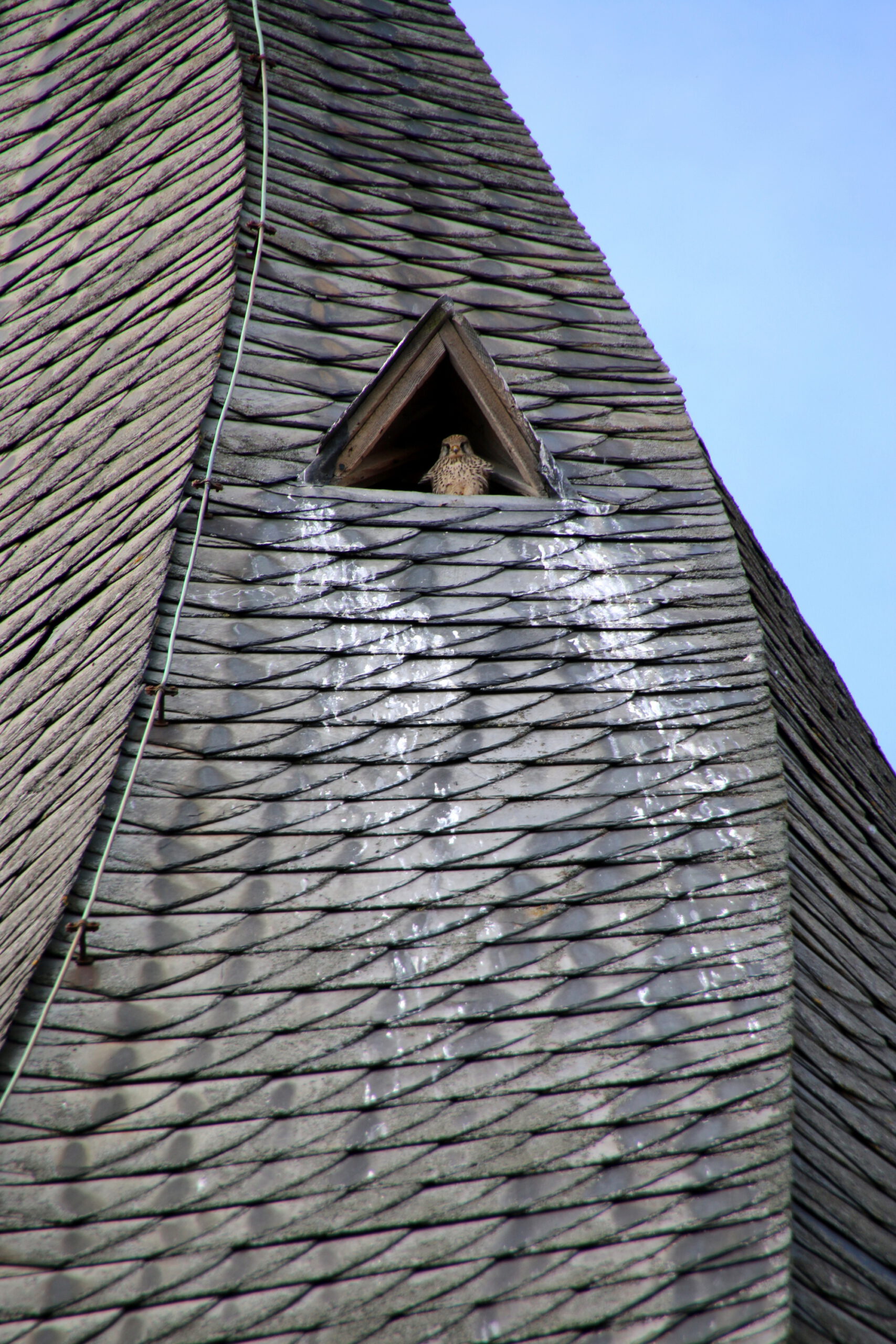 Trotzdem machte ich mich auf den Weg zur Kirche. Warum ich auf die nicht wirklich fotogene Kirchenrückseite gegangen bin, weiß ich eigentlich gar nicht. Der Blick nach oben zur Kirchturmspitze brachte mir dann das heutige Foto des Tages: ein Turmfalke, der auf seinem Nest in einer Fensteröffnung der Turmhaube hockte.